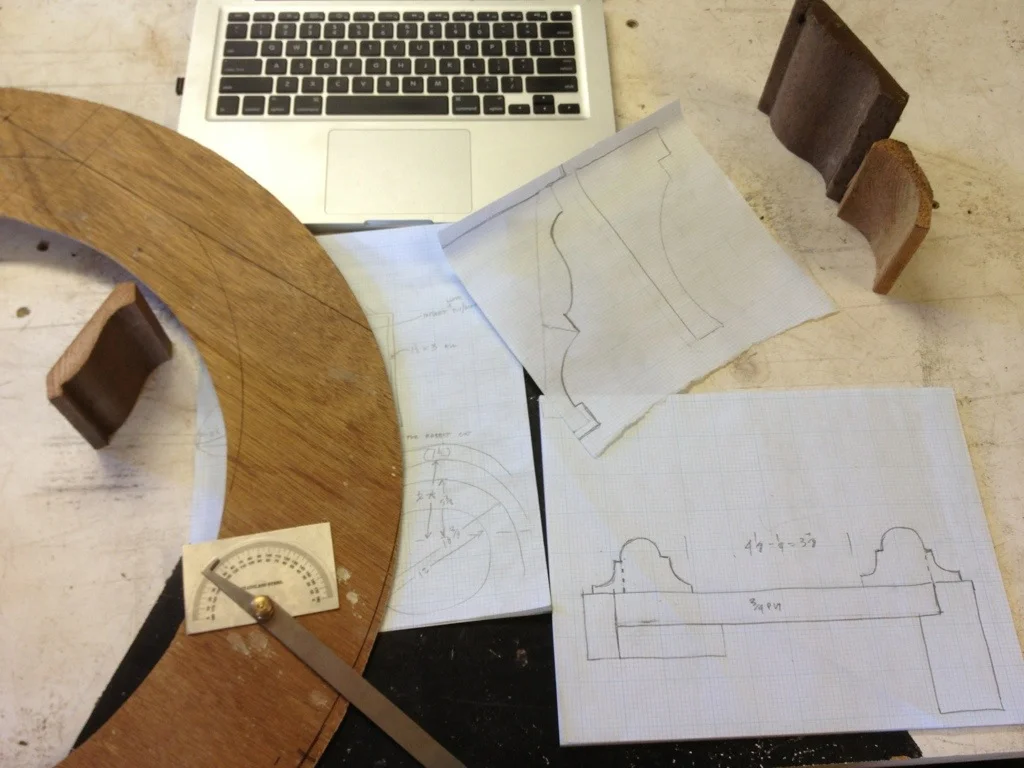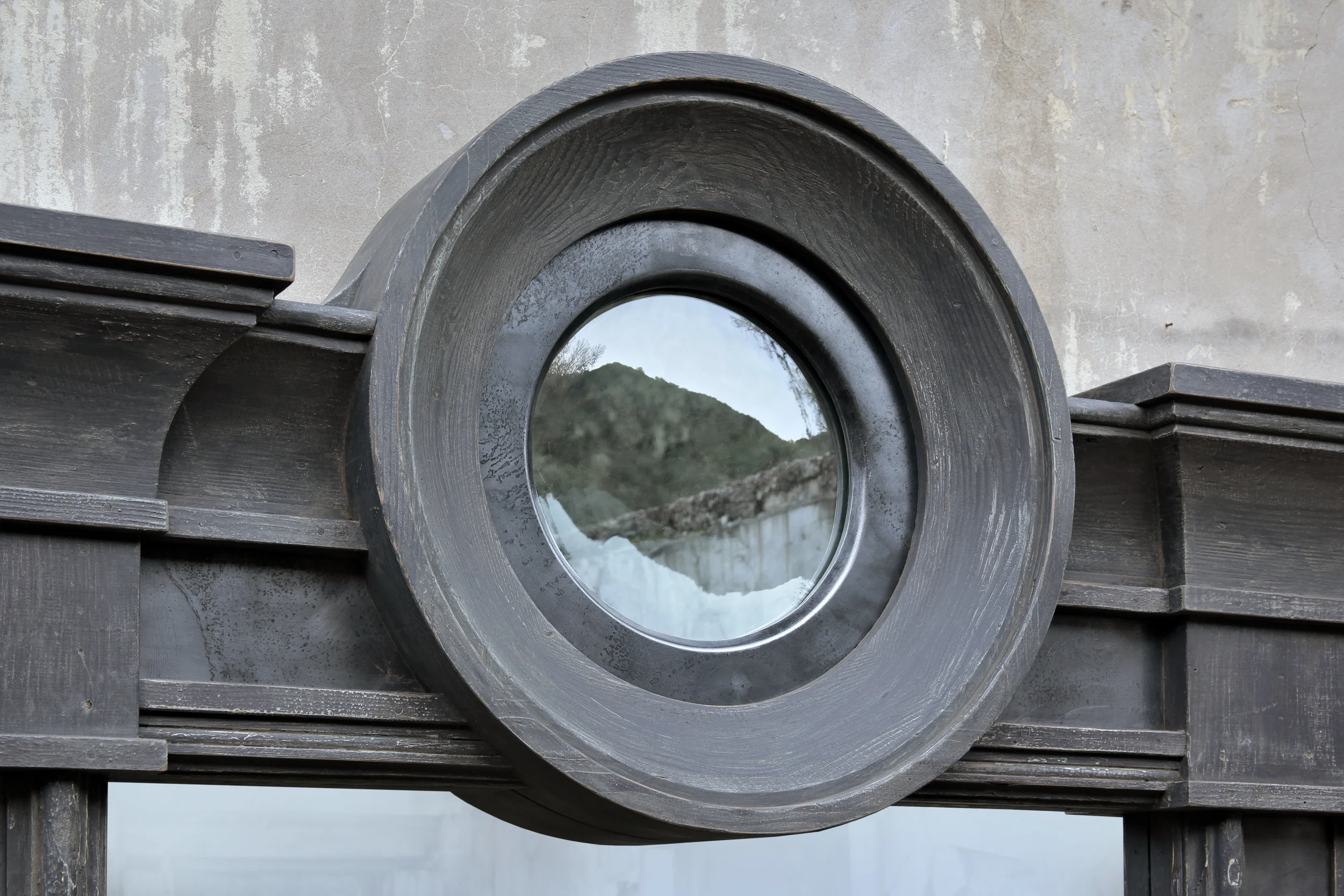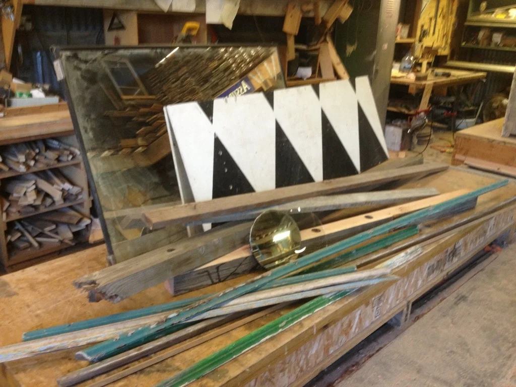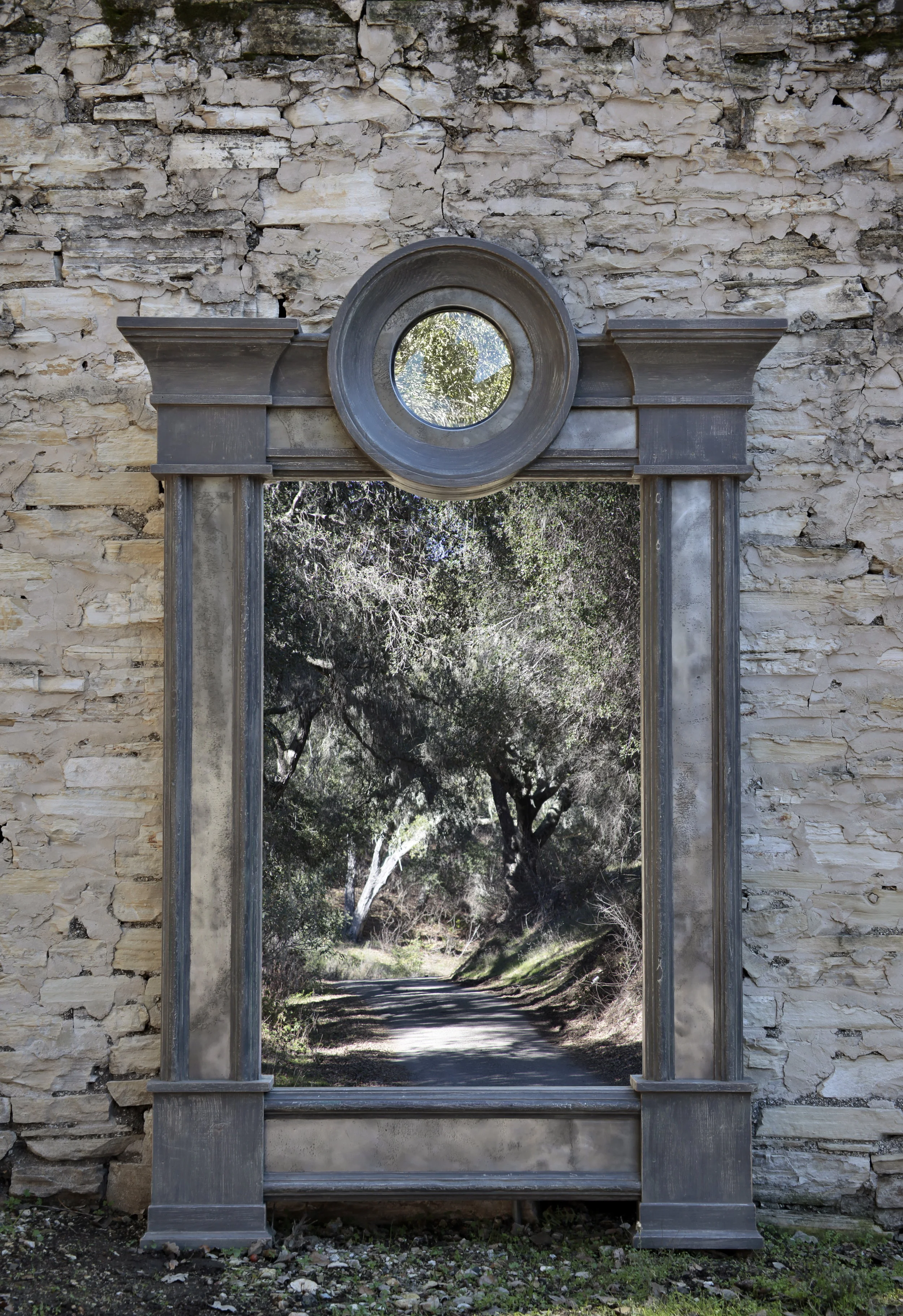 /I built a mirror like this one a couple of years ago for my wife. I decided to rework the design and build another one so I dug up my old notes and sketches and hit the ground running! I generally use a high percentage of reclaimed materials in my work, but my goal for this project was to use almost exclusively recycled materials. As always, there were a few things that I had to break down and buy new, but I ended up using at least 95% reclaimed materials.Here is a list of repurposed parts I used: sliding mirror closet door (main mirror), 12" convex clock face (covering circle mirror), plywood from a used dance floor (sub-structure), concrete form boards (main frame), various old moldings (see photo above), 4" x 6" douglas fir sign posts (cut into crown molding and circle molding) The panels between the moldings are zinc coated steel (not reclaimed). Mirror dimensions: 55" (plus crown) x 95"Photography by Ron Bez (http://www.ronbez.com/)