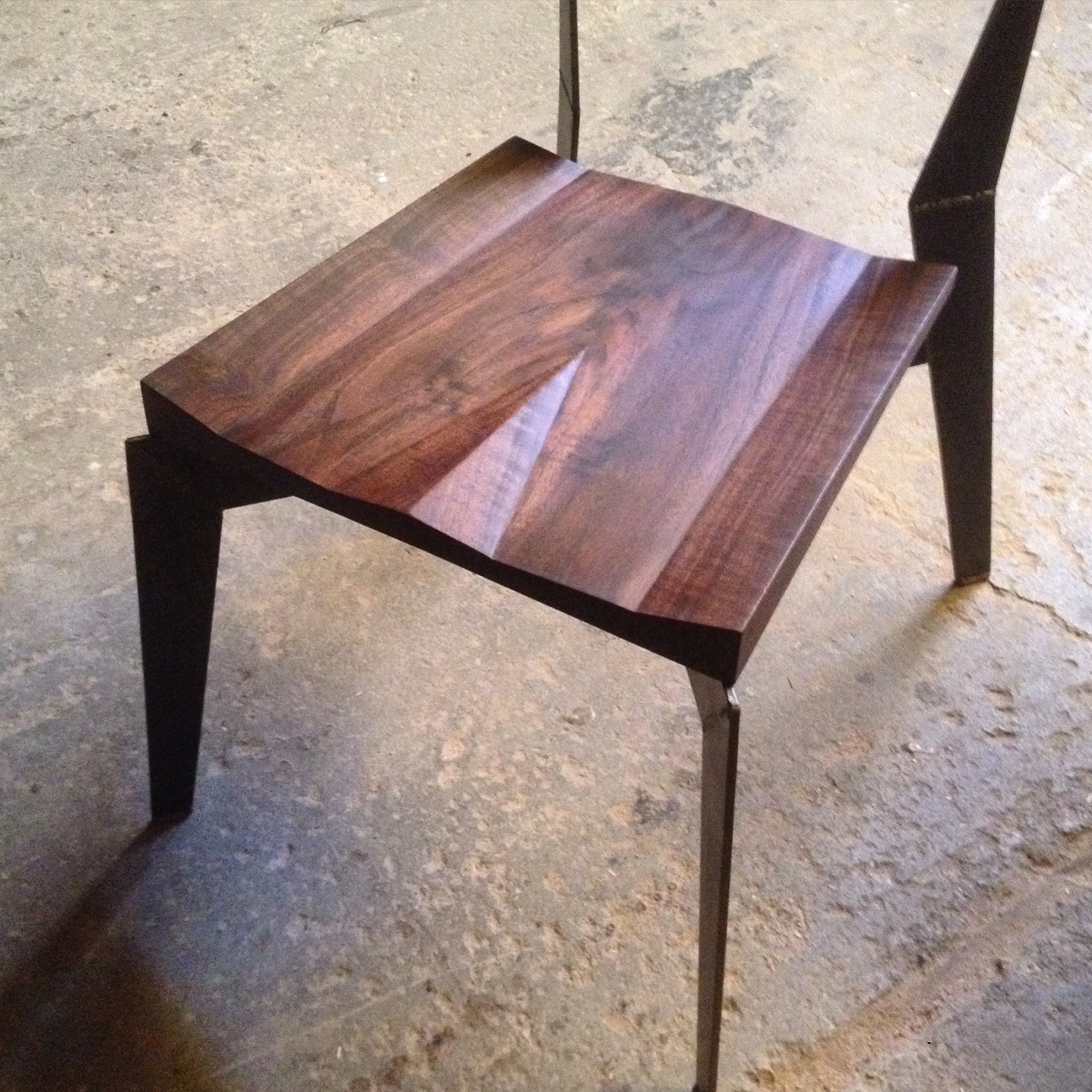 /I've been playing with this chair prototype for a year and a half now and finally starting to get somewhere. I just remade the seat using some figured walnut. The legs are steel with exposed welds.back to benridderingdesign.com