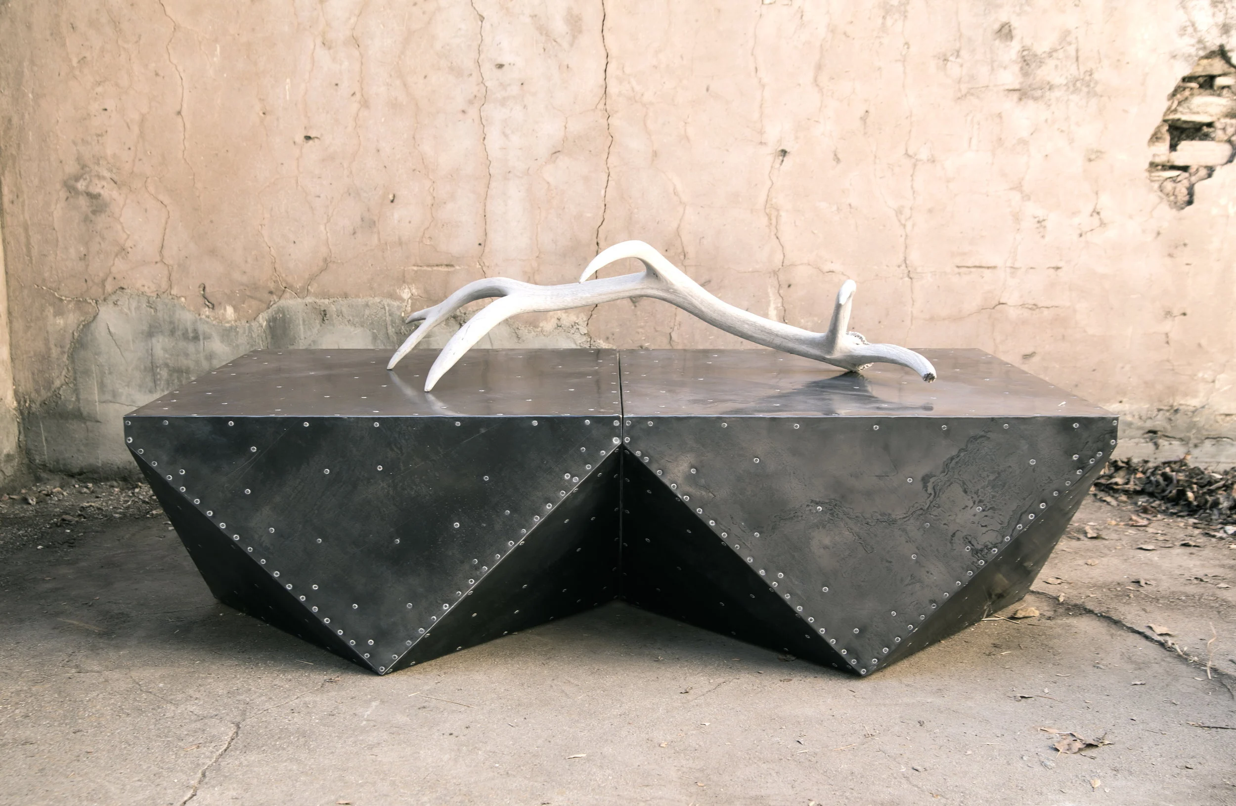 Each steel Cubodron coffee table is hand-clad with steel on all sides. The shape is essentially half of a cubodron shape. They can be arranged in pairs (as shown in the photo) to make a larger table. Also available in copper.